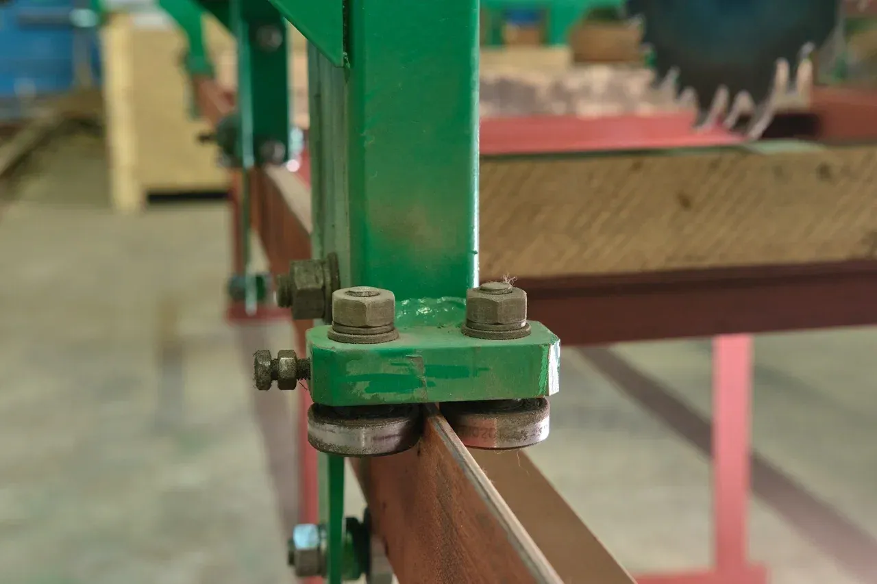 Дисковые пилы сводятся-разводятся от центра станка, также имеется возможность фиксации одной пилы в постоянном положении. Подача каретки вдоль заготовки осуществляется вручную.