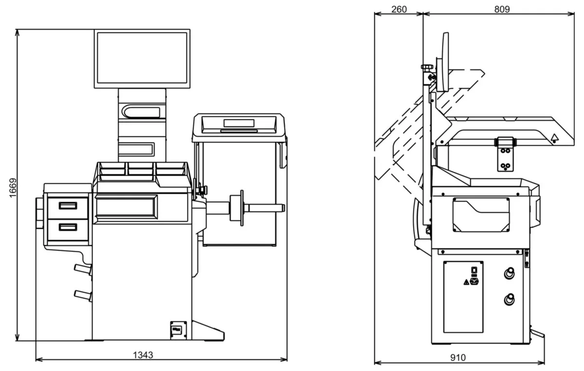 | Габаритные размеры балансировочного стенда (Ш х Г х В), мм, не более - поднятый кожух - опущенный кожух | 1138 х 910 х 1669/1138 х 809 х 1669 |
