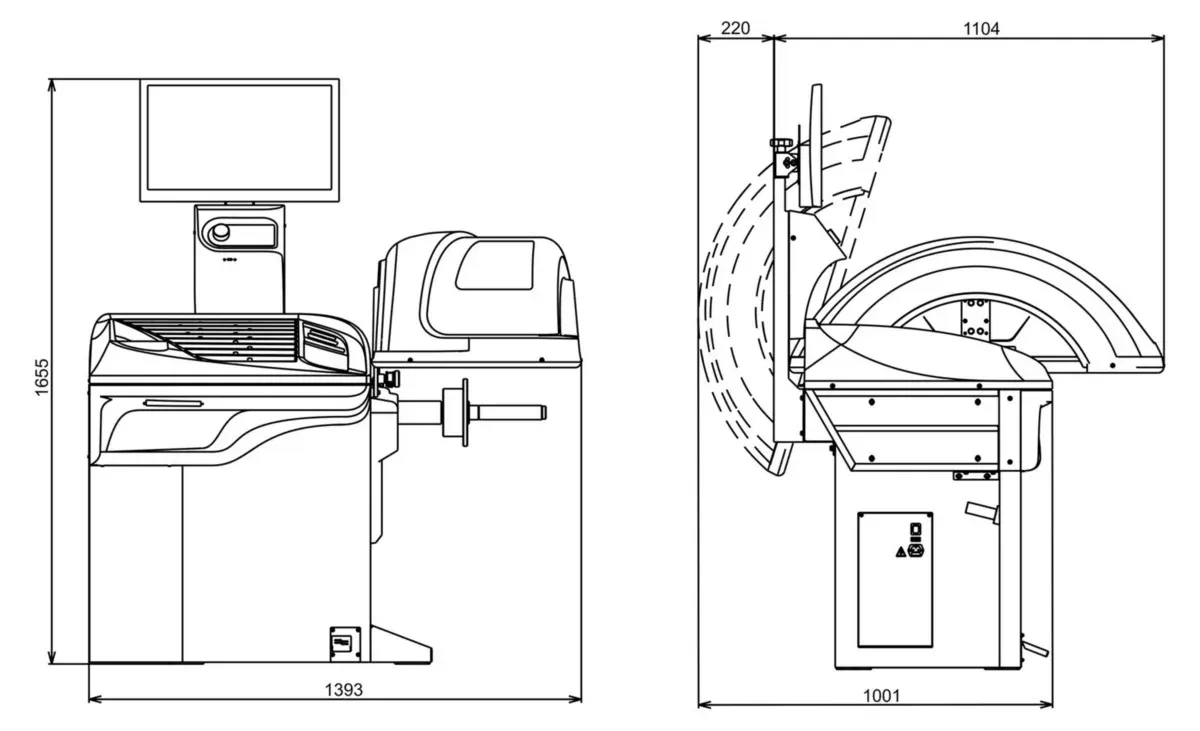 | Габаритные размеры балансировочного стенда (Ш х Г х В), мм, не более - поднятый кожух - опущенный кожух | 1393 х 1001 х 1665 / 1393 х 1104 х 1655 |