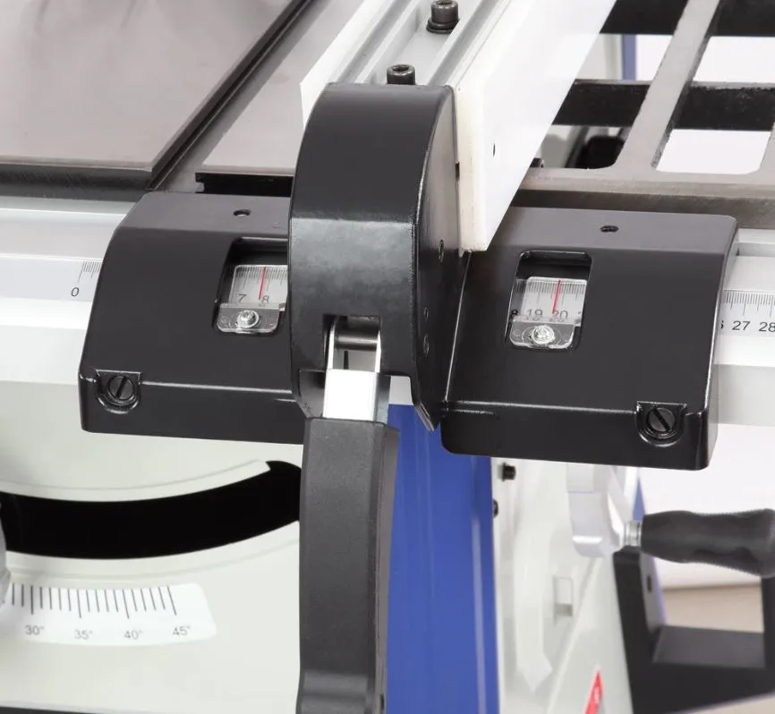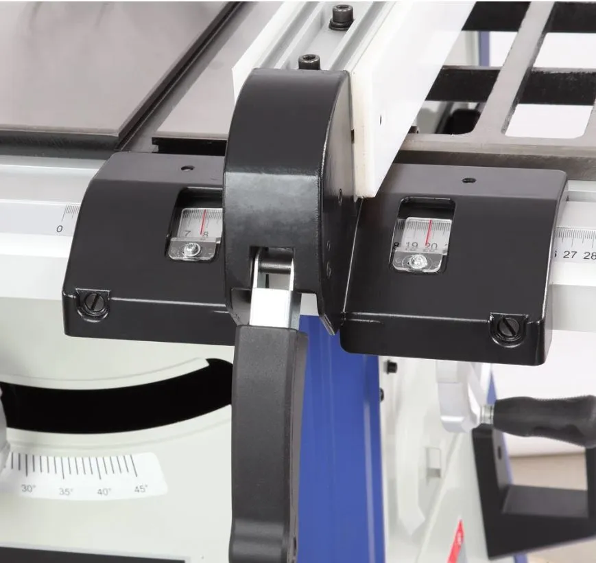 Параллельный упор, выполненный из алюминиевого профиля с накладками из фторопласта, с надежным фиксатором положения на направляющих.