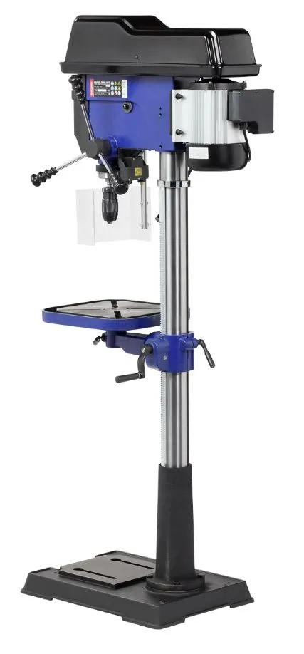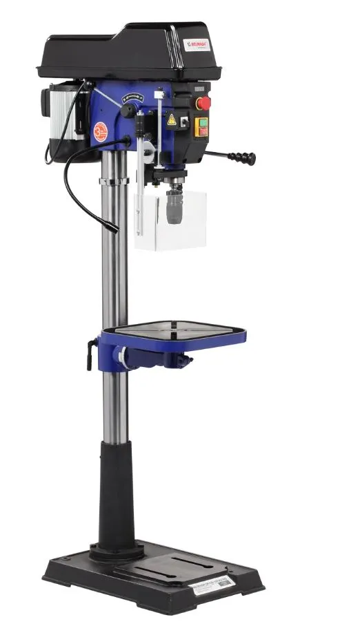 Патрон быстрозажимной с максимальным диаметром зажимаемого хвостовика инструмента 16 мм, посадка В16. На колонне, ее диаметр 80 мм, имеется зубчатая рейка, поднятие/опускание стола настраивается с помощью рукоятки. Управление станком осуществляется кнопками – «пуск», «остановка». Выключатель имеет крышку.