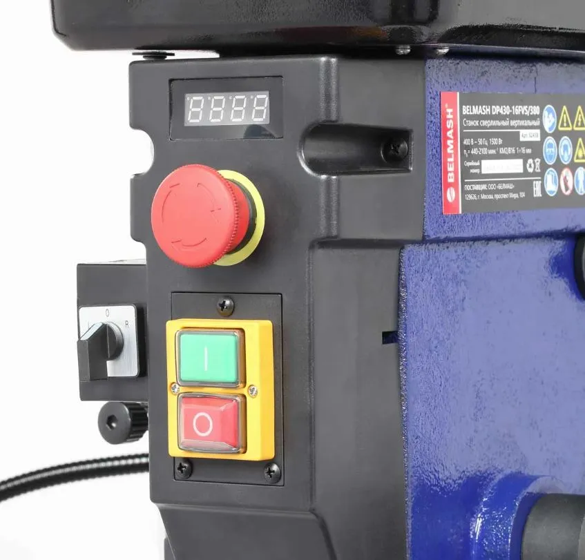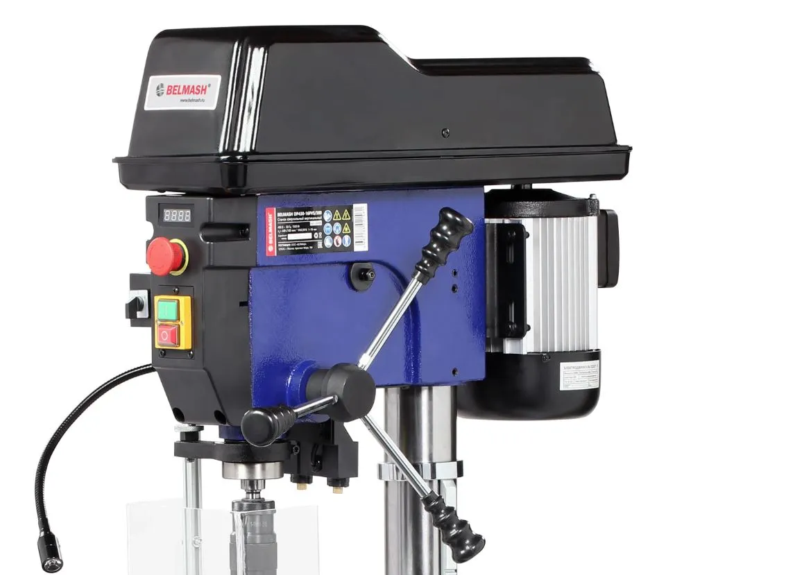 Станок предназначен для обработки различных материалов вращающимся режущим или шлифующим инструментом, с целью получения сквозных или глухих отверстий, растачивания, зенкерования. BELMASH DP430-16F/380 – это самый один из самых мощных станков в модельном ряду – 1100 Вт, рассчитанный на подключение к сети 230 В. Исполнение напольное. Стол, опора и корпус сверлильной головки выполнены из чугуна, поэтому масса приближается к 80 килограммам. Станок высокий – 1630 мм, подходит для обработки заготовок большой толщины. Максимальное расстояние между шпинделем и столом – 685 мм.
