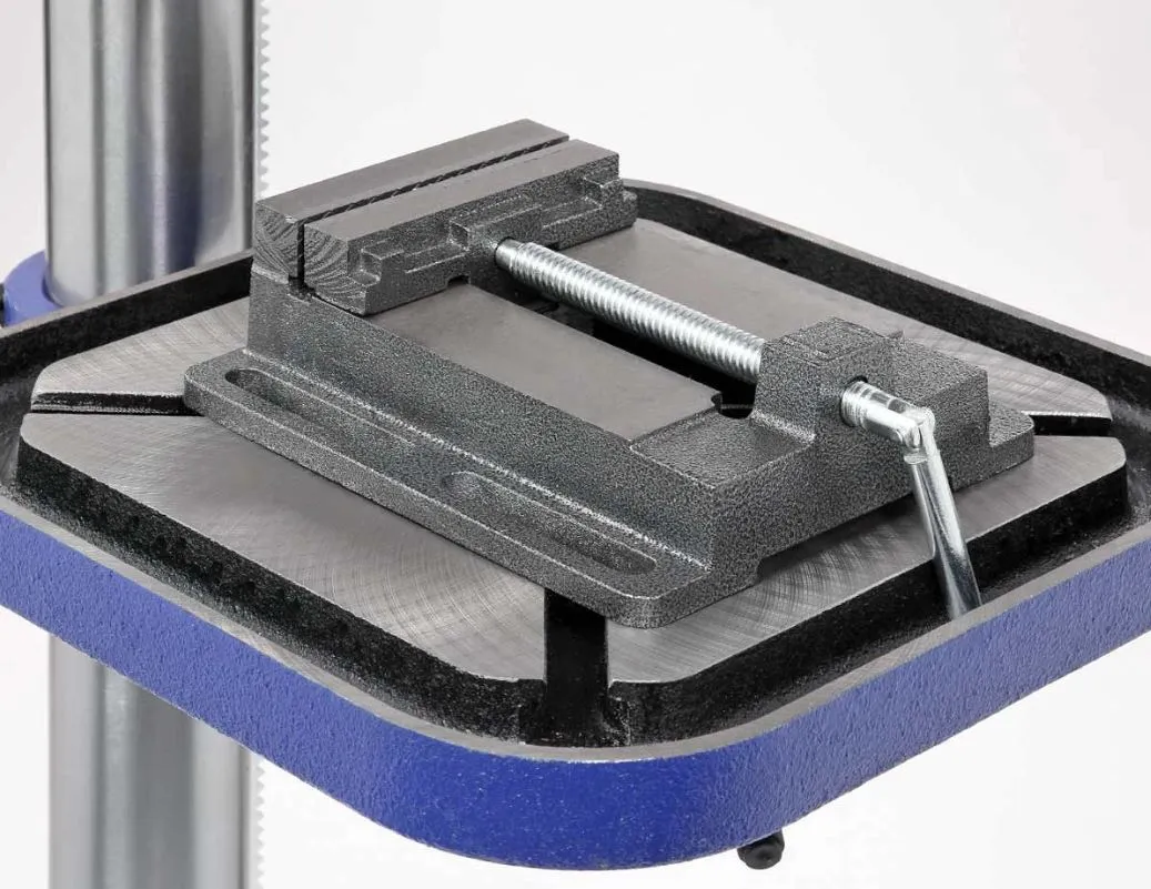 Заготовку можно крепить как к рабочему столу, так и к основанию, все зависит от ее размера. В комплекте предусмотрены тиски. Для их крепления есть два Т-образных паза на рабочем столе и два паза на основании. Основание станка массивное, что обеспечивает устойчивость, хотя для дополнительной фиксации есть четыре отверстия. Для точного позиционирования режущего инструмента станок оснащен лазером-указателем. Кроме него работу облегчит подсветка рабочей зоны. Ход пиноли составляет 80 мм. Наконечники тройной рукояти удобной формы, что способствует плавной подаче сверла к заготовке.
