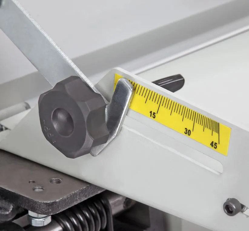 Входящий в базовое оснащение стальной трехножевой строгальный вал прост в эксплуатации (имеет стандартные регулировки), а за счет частоты вращения в 5500 об/мин. обеспечивает чистый рез. Для строгания по торцу или под глом от 90 до 45 градусов станок оборудован параллельным упором, который выполнен в жесткого алюминиевого профиля.