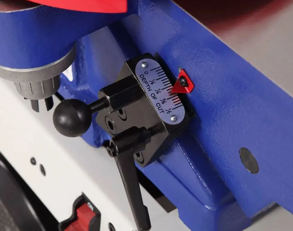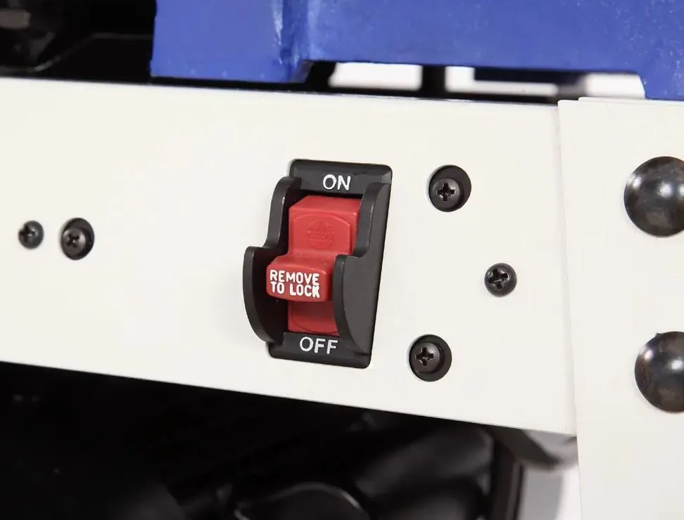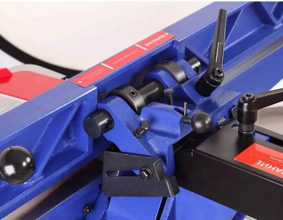 Рабочий стол и параллельный упор выполнены из чугуна. Для безопасной работы станок оборудован литым защитным кожухом ножевого вала. Также в комплекте есть специальные упоры для подачи заготовки. Устройство выполнено на литой станине, оснащено подкатным приспособлением.