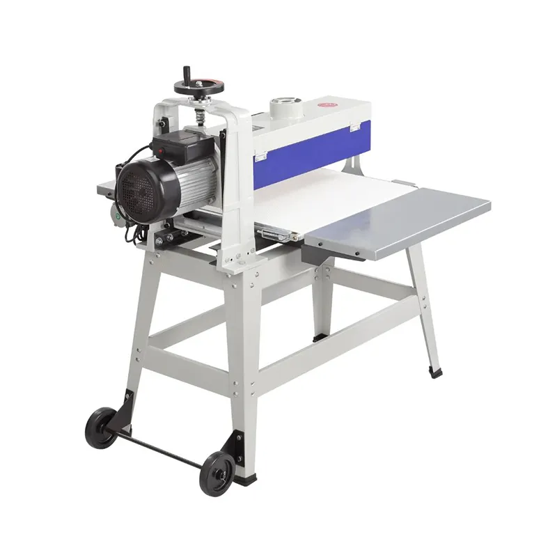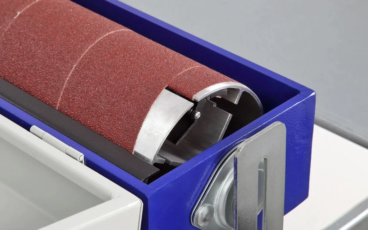- Шлифовальный барабан имеет консольное расположение. При необходимости обработки более широких заготовок можно снять левую стойку и в два прохода обрабатывать детали шириной до 500 мм.