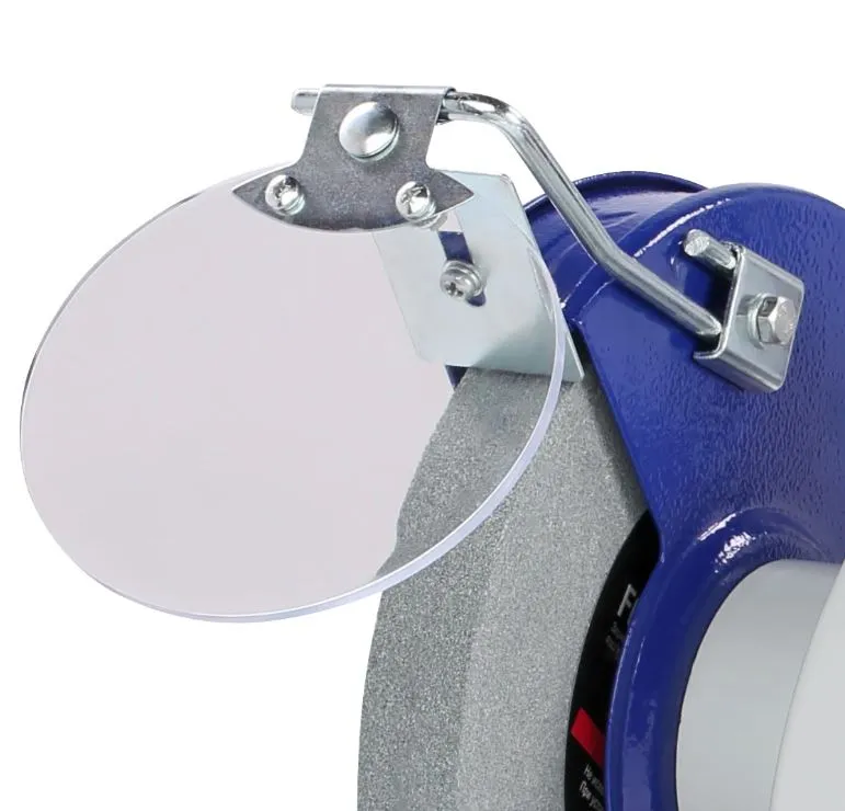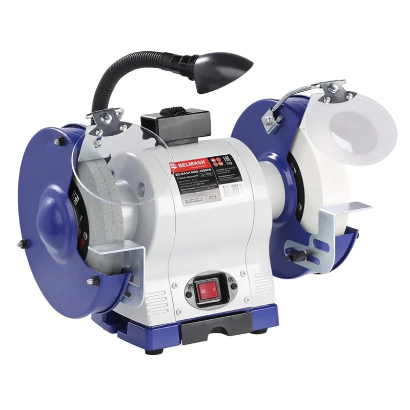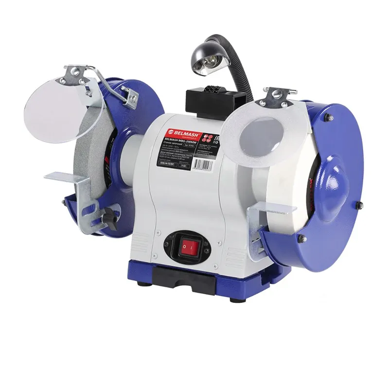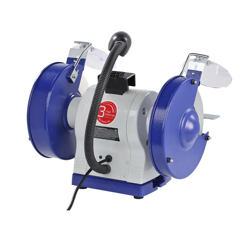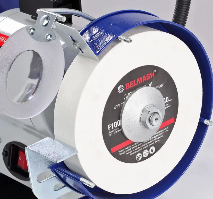 Электромотор мощностью 600 Вт приводит в движение два вертикально расположенных диска. Они находятся по разные стороны двигателя и имеют разную зернистость, что позволяет выполнять не только заточку, но и шлифовку, обдирку, полировку. Диски вращаются со скоростью 2850 об/мин, что обеспечивает повышенную скорость работы.