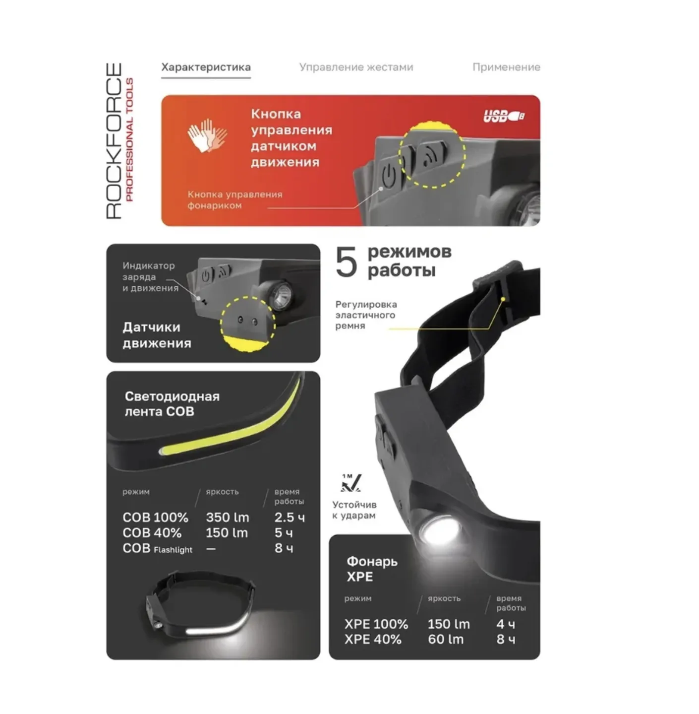 5 режимов освещения для любых задач Модель имеет основную светодиодную ленту и боковой XPE-LED-фонарь. Доступны такие режимы: