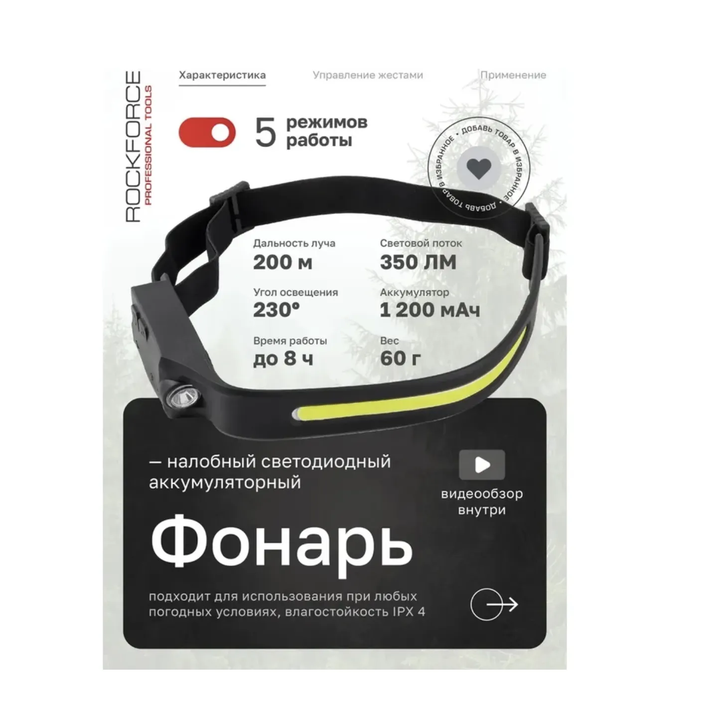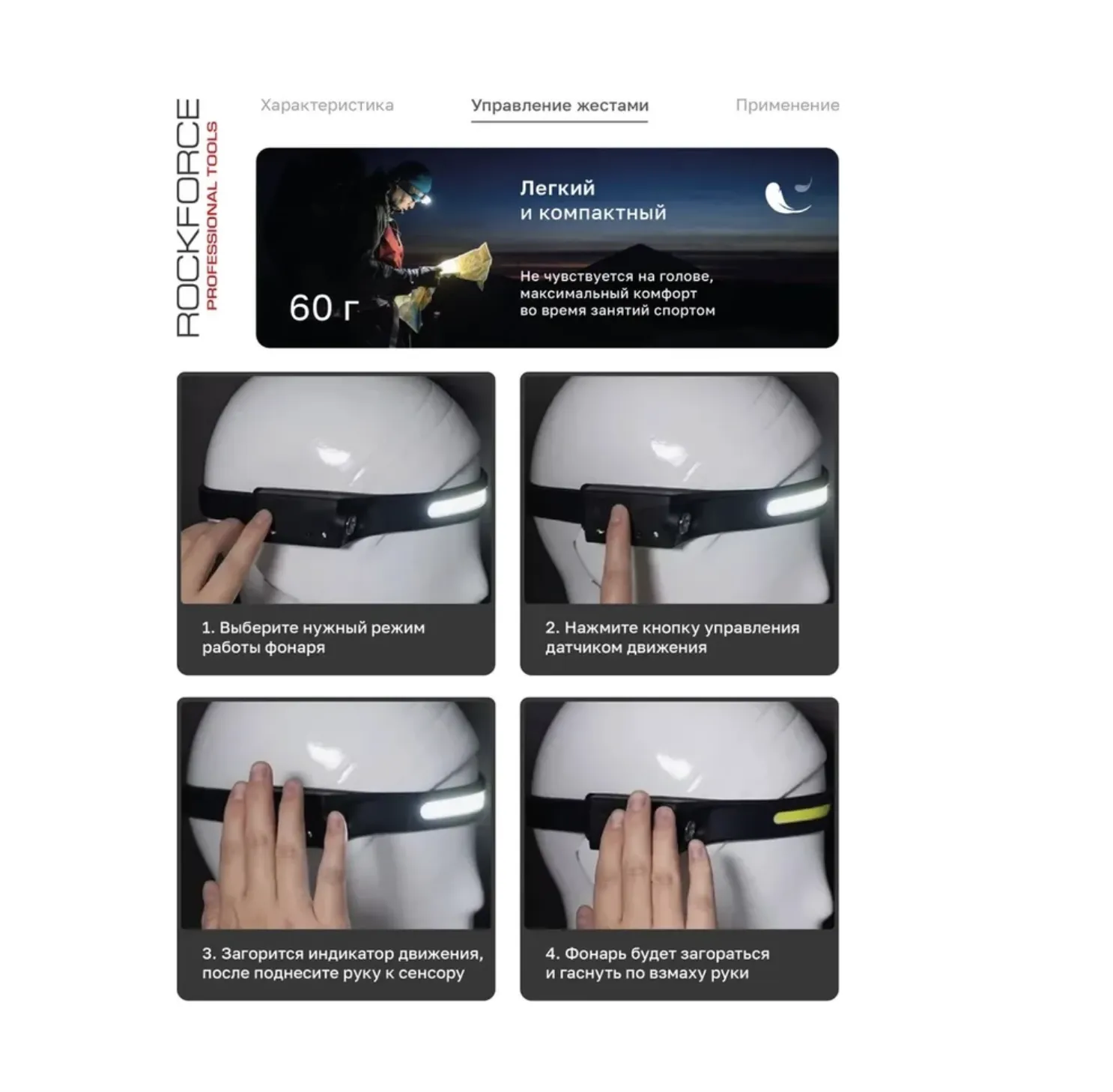 Умное управление — одним взмахом руки Подсветка активируется датчиком движения: достаточно взмахнуть рукой, чтобы включить свет. Также предусмотрена классическая кнопка включения. Рядом расположена клавиша активации датчика. Это удобно при работе в перчатках, в темноте или в труднодоступных местах.