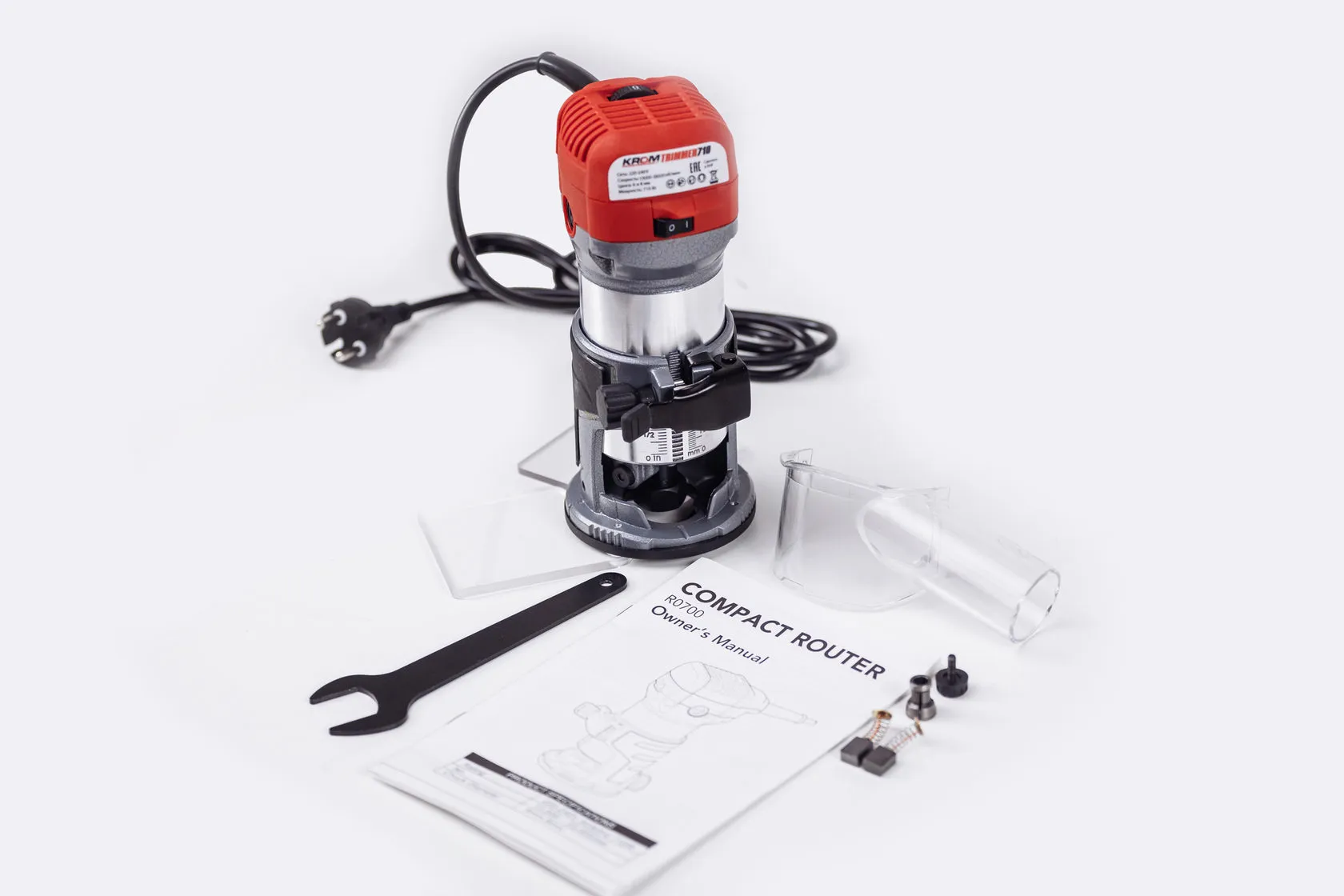 В комплектации Вы обнаружите: сам триммер, опорную площадку из композита с крепежом, комплект запасных щёток, ключ для смены фрезы, переходные цанги на 6мм и 8мм, патрубок для подключения пылесоса.