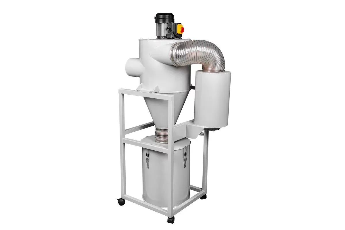 Бункер для сбора опилок выполнен из металла и имеет колесики для удобства перемещения. Она работает от сети 220 вольт и подключается прямо в розетку. Есть кнопка пуска/остановки с функцией защиты. Для подключения используется одна гофрошланга диаметром 100 мм. Шланг подключается сбоку. Несмотря на небольшую мощность (0,75 кВт), данная аспирация благодаря своим конструктивным особенностям обеспечивает достойную производительность в 2000 м³/час.