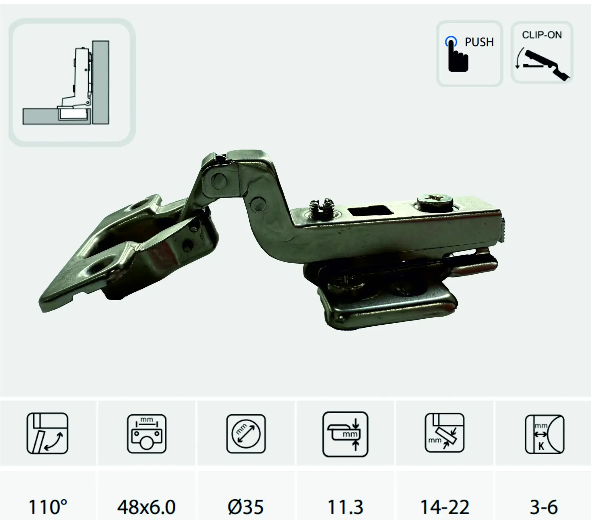 Петля GS CLIP-ON вкладная, без пружины, 48*6,0 площадка Н=0, 3D