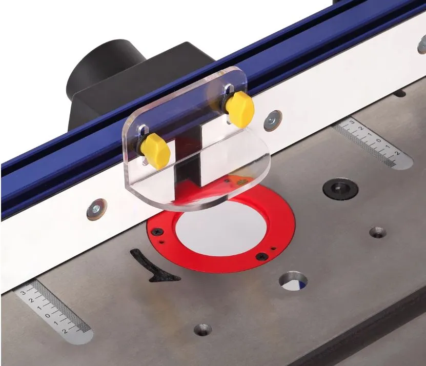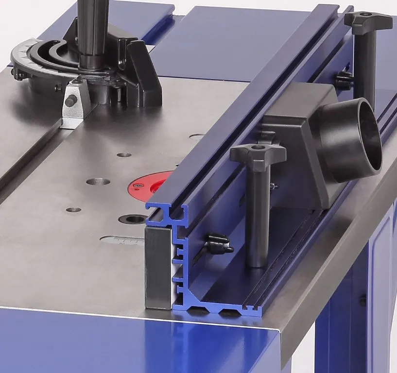 Упор имеет основание, изготовленное из высокоточного алюминиевого профиля. Оснащен двумя раздвижными накладками из МДФ размером 290×63 мм каждая (Д×В), фиксирующиеся гайками-барашками. Ход накладки составляет 52 мм. Общая высота упора - 80 мм. Длина упора с максимально разведенными в обе стороны щечками - 705 мм. На верхней части упора имеется два специальных паза под установку защитного экрана и прижимов (в комплект поставки не входят). Сзади размещен патрубок для отведения отходов резания (диаметр 63,5 мм), положение патрубка можно регулировать.