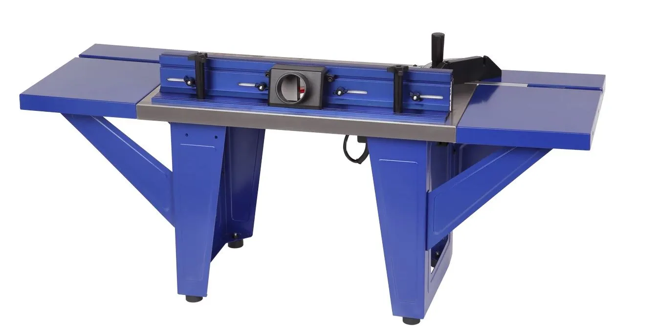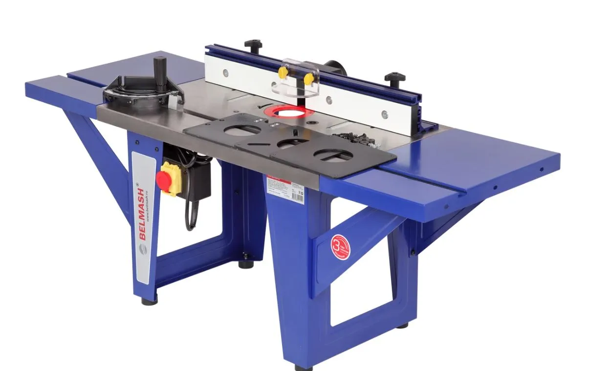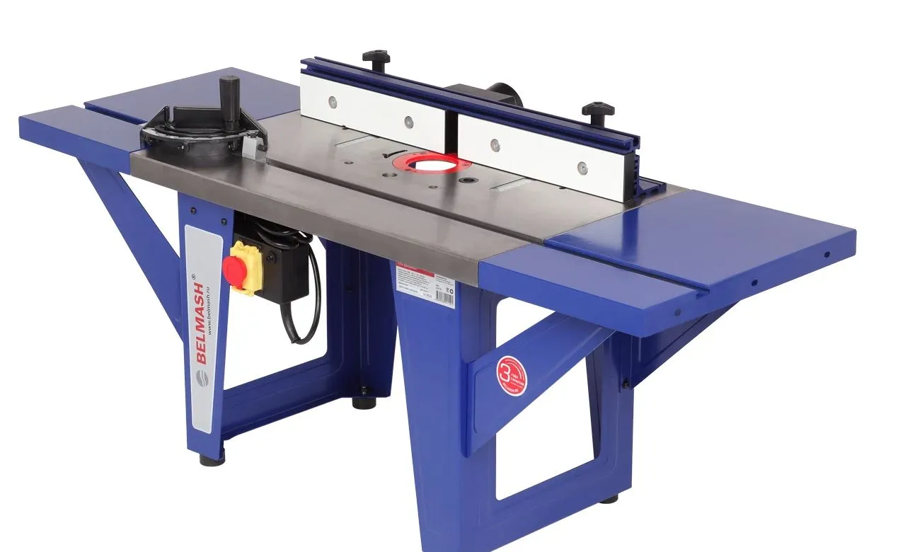 Рабочая поверхность составная - 1150×400 мм. Основной стол из чугуна. По бокам от него крепятся два удлинения по 250 мм из листовой стали. Имеются отверстия под установку упора и пластин. В центральной части есть две шкалы для точного позиционирования положения упора. Параллельный упор может располагаться как справа, так и слева от режущего инструмента. Его ход составляет 0-40 мм и 0-30 мм. Имеется два отверстия для регулировки высоты вылета фрезы: первое - общего плана под пластину №1, второе - под пластину для лифта BELMASH D033A. Основной и дополнительные столы имеют паз под установку углового упора (-60...+60 град.).