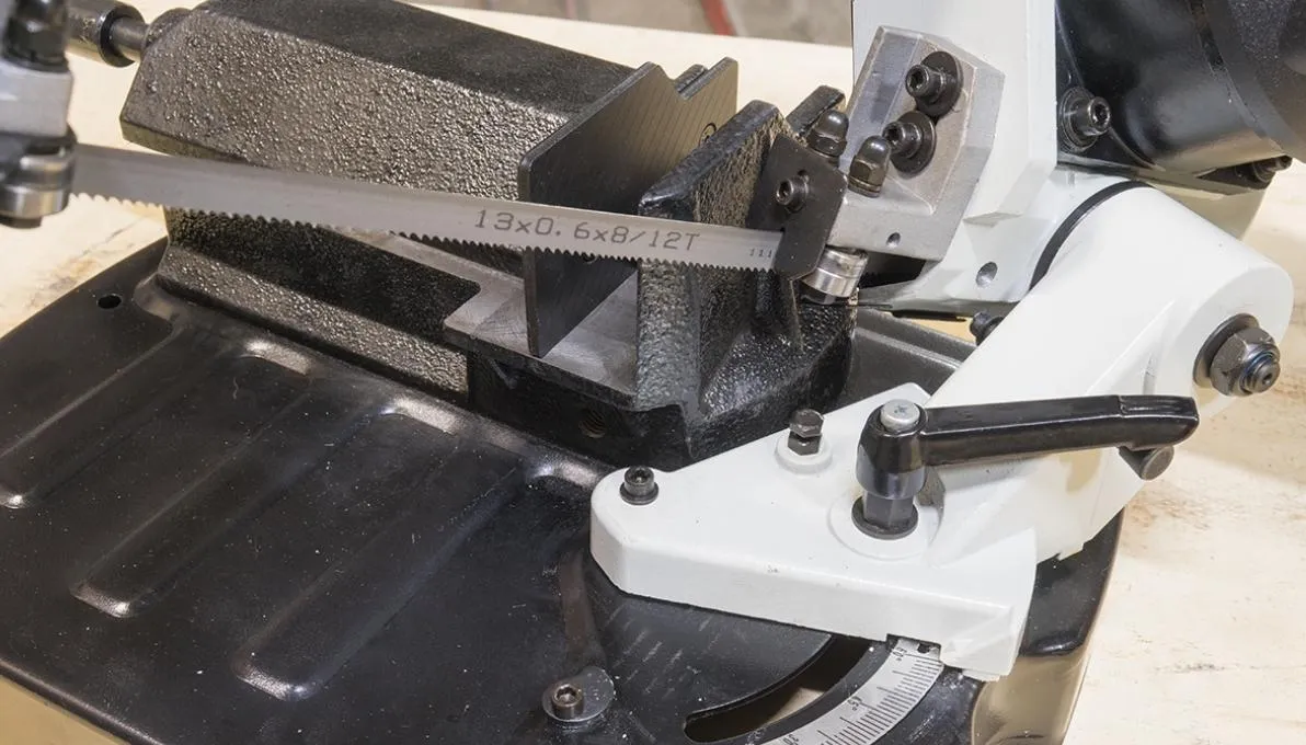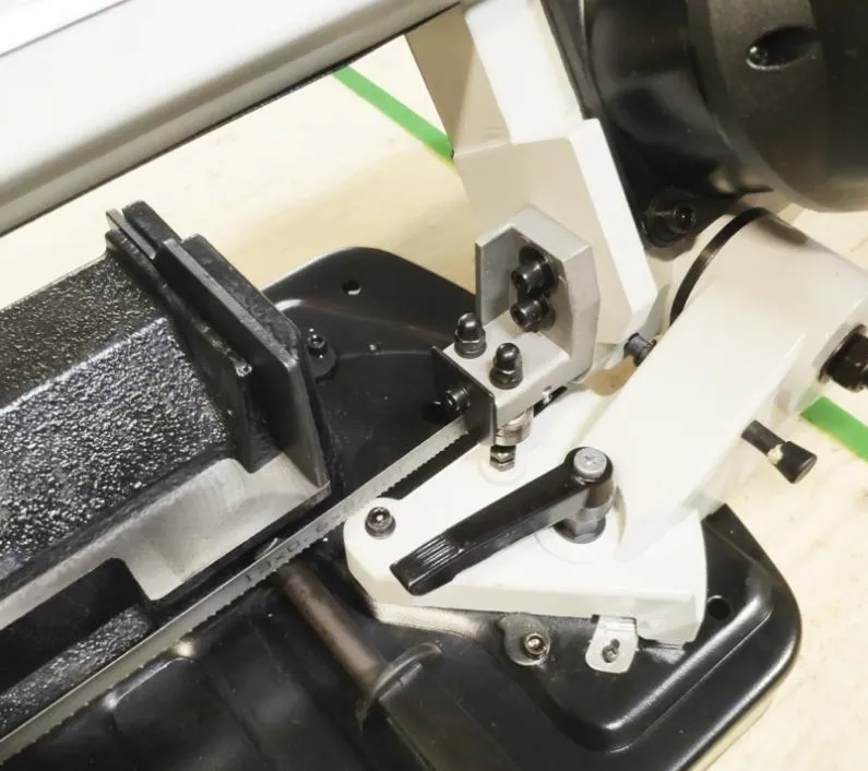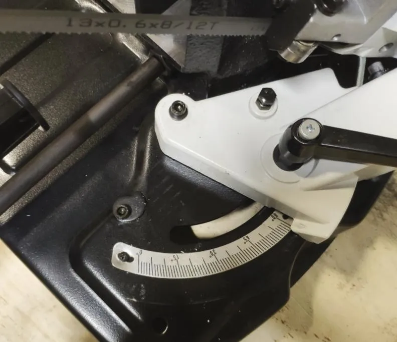 В рабочей зоне резания полотно точно ведется двумя направляющими головками. Поворот корпуса пилы от 0° до +45°, предназначен для пиления заготовок, под различными углами и при частой смене угла пила.