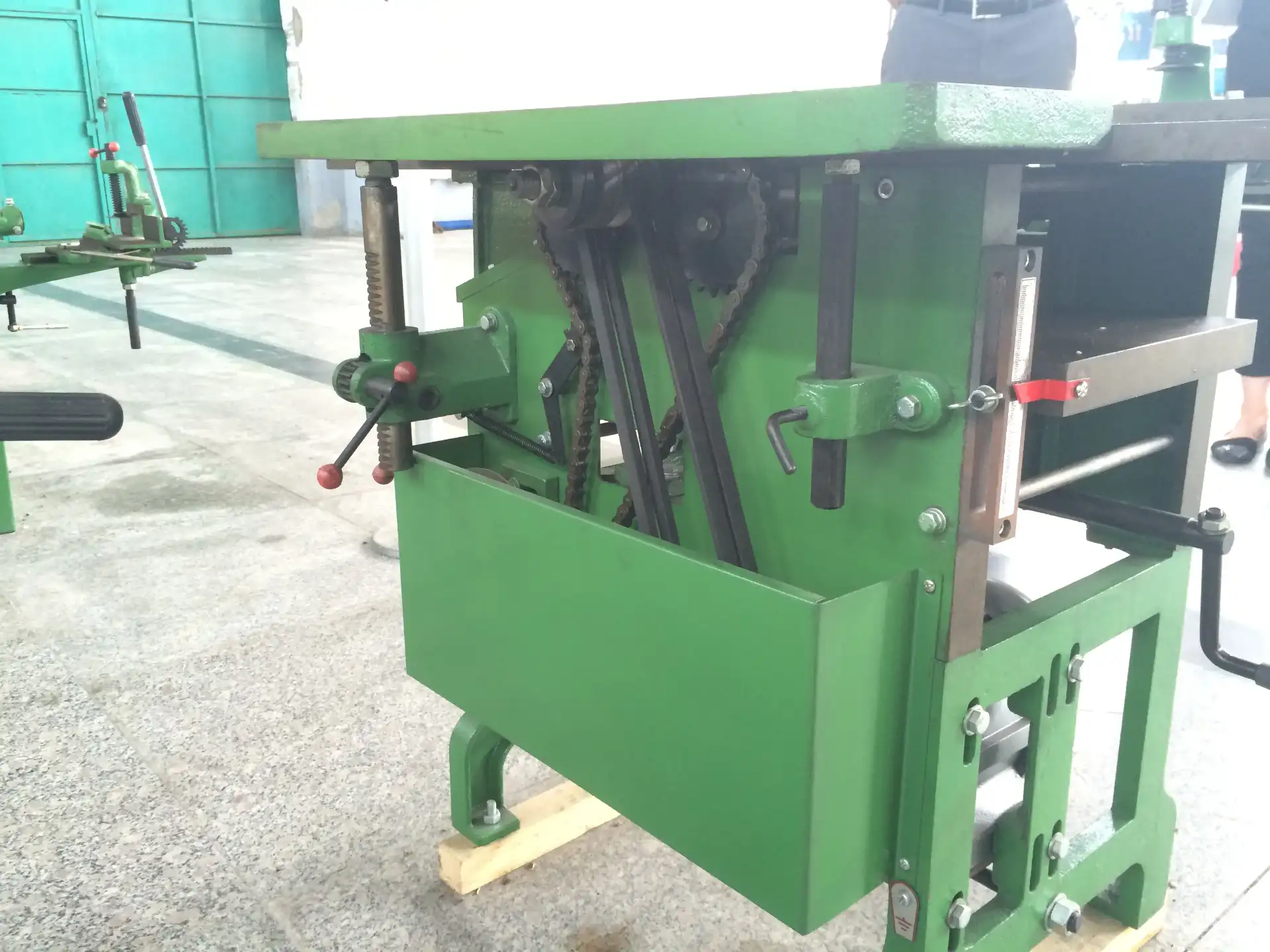 ЖЕСТКАЯ РЕГУЛИРОВКА ПОЛОЖЕНИЯ РЕЙСМУСОВОГО СТОЛА. Регулировка стола осуществляется с помощью червячной передачи, что гарантирует постоянство выставленного размера, даже при строгании твердых, тяжелых пород дерева.