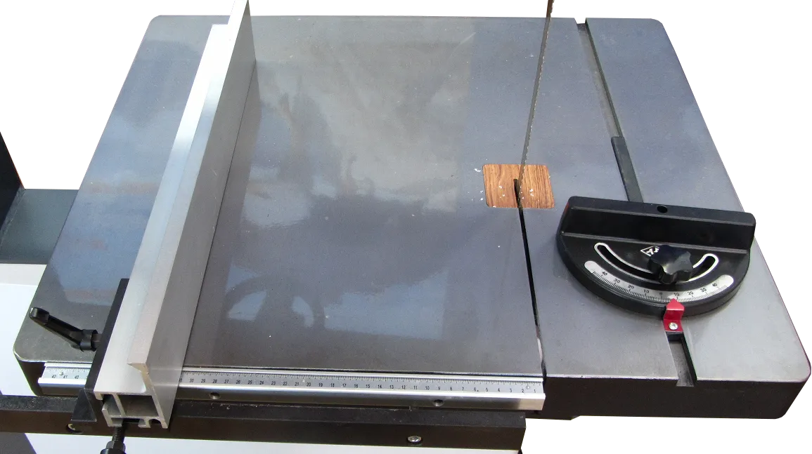 Чугунный стол. Массивный рабочий стол из серого чугуна.Направляющая линейка на столе настраивается по миллиметровой шкале. Толкатель с угловой шкалой для удобства подачи заготовок.