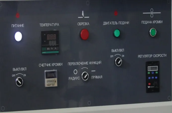 находится счетчик длины кромки и регулировка скорости подачи. - Смена режима обработки с криволинейных деталей на прямолинейные осуществляется с помощью переключателя.
