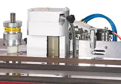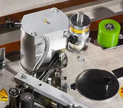 Клеевой узел. Два клеенаносящих вала обеспечивают наилучшее приклеивание кромки. Один вал наносит клей на деталь, второй вал на кромку. Идеальный вариант в случае использования рыхлого ДСП.
