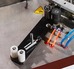 Направляющий кромочный канал. Не требуется настройка на толщину кромки. Кромочный канал состоит из четырех роликов.Производиться регулировка ограничительной планки только на ширину кромочного материала.