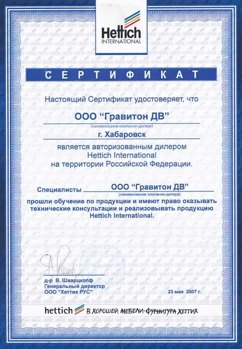 С 2007 года компания "Hettich" является партнером "Гравитон ДВ". "Hettich" - это высококачественная европейская фурнитура для производства мебели.