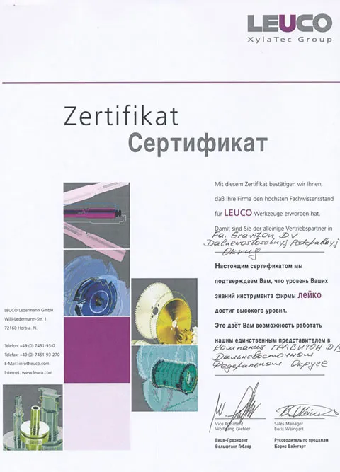Компания "Гравитон ДВ" является единственным официальным представителем фирмы "LEUCO" по Дальневосточному Федеральному округу. Представляем всю линейку высококачественного оборудования и инструмента "LEUCO".