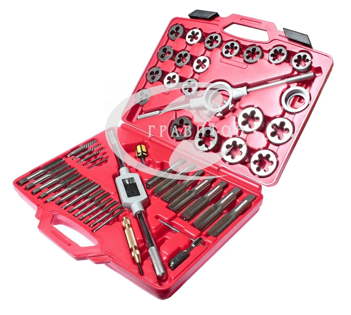 - Плашки, наружный диаметр 1-1/2": М6х0.75, М6х1.0, М8х1.0, M8х1.25, М10х1.25, M10х1.5, M12х1.25, M12х1.5, M14х1.5, M14х2.0, M16х1.5, M16х3.0, M18х1.5, M18х2.5 - 14 шт.